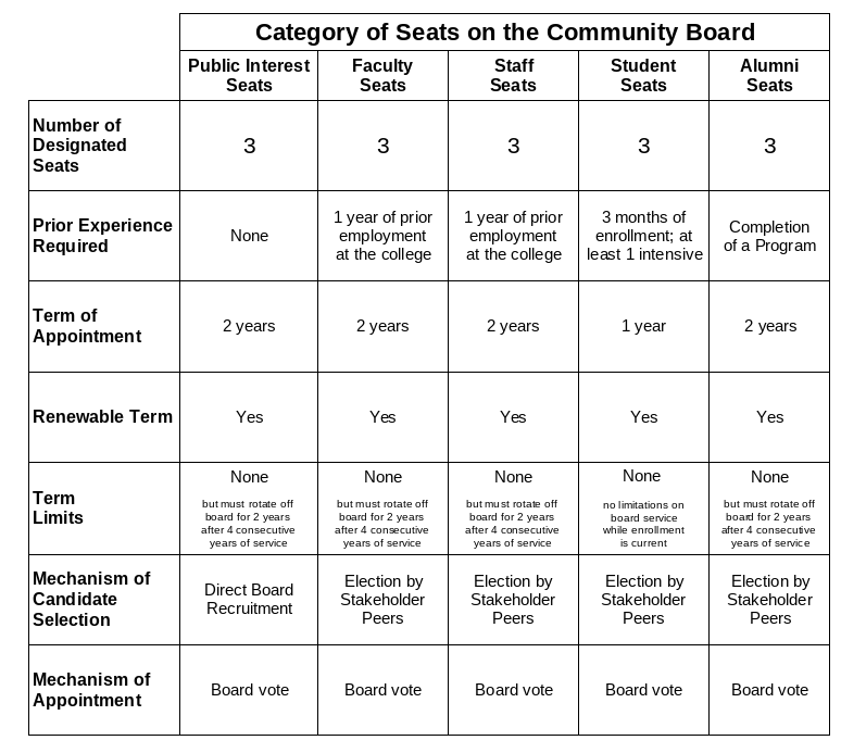 The Community Board shall comprise 15 designated voting seats. One (1) group of seats shall be designated for board members who are appointed to represent the public interest. Four (4) groups of seats shall be designated for board members who are elected by Academy stakeholder groups. See § 2.2.7. (Table 1) for an overview of the characteristics of the seats on the Community Board.